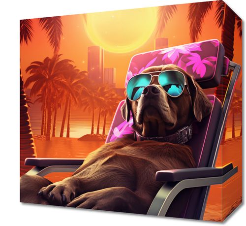Obraz z serii pop art zatytułowany Lato w Stylu. Na tej zabawnej ilustracji widzimy psa rasy labrador, wygodnie ułożonego na leżaku plażowym, w okularach przeciwsłonecznych, z tłem zachodzącego słońca i palm. Jego relaksująca poza i luźny styl, w połączeniu z żywymi kolorami tropikalnego wschodu lub zachodu słońca, oddają atmosferę beztroskich wakacji. Obraz ten jest idealnym wyborem dla miłośników psów i letnich klimatów, świetnie nadaje się do dekoracji ścian w domach, hotelach nad morzem, czy jako dodatek do letnich barów i restauracji, wprowadzając element humoru i wakacyjnego luzu.