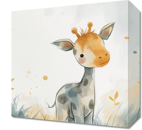 Obraz z serii wnętrza zatytułowany Mała Żyrafka. Uroczy obraz przedstawia młodą żyrafę o łagodnym spojrzeniu, wyłaniającą się z akwarelowej mgły pastelowych barw. Delikatne krople farby i subtelne linie tworzą atmosferę czystości i spokoju, nadając dziełu ciepły i relaksujący nastrój. Ten obraz, emanujący dziecięcą niewinnością i ciekawością świata, będzie idealnym dodatkiem do przestrzeni dziecięcej, takiej jak pokoje maluchów, przedszkola lub miejsca oczekiwania w placówkach pediatrycznych, zachęcając małych i dużych do marzeń i odkrywania piękna przyrody.