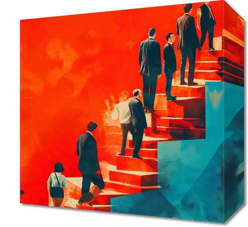 Obraz z serii abstrakcja zatytułowany Metafory Sukcesu. Przedstawia on różne postacie w formalnym ubiorze, wchodzące i schodzące po schodach, które rozdzielają się i zbiegają w różnych kierunkach. Tło obrazu jest podzielone na dwie kontrastujące strony - jedna w odcieniach czerwieni, a druga w chłodnych błękitach, symbolizując różne ścieżki i wybory w życiu zawodowym lub osobistym. Styl graficzny łączy elementy abstrakcyjne i figuralne, a silne kontrasty kolorystyczne podkreślają dynamikę i złożoność podejmowanych decyzji. Obraz ten mógłby być inspirującym dodatkiem do biura lub przestrzeni pracy, zachęcającym do refleksji nad własnym rozwojem i aspiracjami.