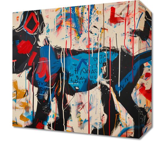Obraz z serii abstrakcja zatytułowany Miejski Pies. Żywa kompozycja przedstawia sylwetkę psa w stylu street art w której dominują kolory takie jak czerwień, niebieski i żółty, które są rozmieszczone na płótnie w sposób dynamiczny i spontaniczny. Praca wydaje się być pełna ruchu dzięki pociągnięciom pędzlem i kroplom farby rozpryskującym się w różnych kierunkach. Na pierwszy plan wyłania się czarna sylwetka psa, której kontury są podkreślone kontrastującymi barwami i szkicowym stylem. W tle można dostrzec chaotyczne linie i formy, które mogą symbolizować miejski chaos i energię, a także fragmenty tekstu, które dodają dziełu charakteru ulicznego muralu. Całość sprawia wrażenie radosnej i pełnej energii ekspresji artystycznej. Świetnie sprawdzi się w nowoczesnych przestrzeniach miejskich.