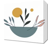 Obraz z serii boho zatytułowany Miska Roślinności.Obraz ukazuje symetryczną kompozycję roślinnych motywów w prostych, czystych formach. Geometryczne kształty w spokojnej palecie kolorów harmonijnie współgrają z naturalistycznymi akcentami roślinnymi. Złote i żółte kręgi mogą symbolizować słońce, które ożywia i rozjaśnia scenę. Dzieło to wprowadza do przestrzeni elementy natury w uporządkowany, niemal medytacyjny sposób. Idealnie nadaje się do wnętrz, które aspirują do spokoju i równowagi, od nowoczesnych salonów po ciche kąciki do czytania lub relaksu. Zapewnia przytulność i jednocześnie zachowuje czystość i prostotę estetyczną.