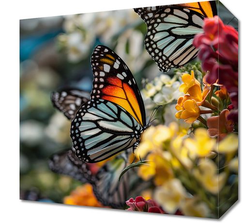 Obraz z serii natura zatytułowany Motyle Na Łące. Na obrazie widnieje trio monarchów, które z gracją spoczywają na kwitnących kwiatach, ich pomarańczowo-czarno-białe skrzydła wyłaniają się z tła pełnego barw i życia. Delikatne odcienie kwiatów w różnych odcieniach żółci, czerwieni i pomarańczy podkreślają naturalne piękno i delikatność motyli, a rozmyte tło nadaje kompozycji głębi i subtelności. Ten obraz jest celebracją życia i przemijania, idealnym do wnętrz, które pragną odzwierciedlić piękno i efemeryczność przyrody, jak salony, spa, czy pokoje wypoczynkowe.