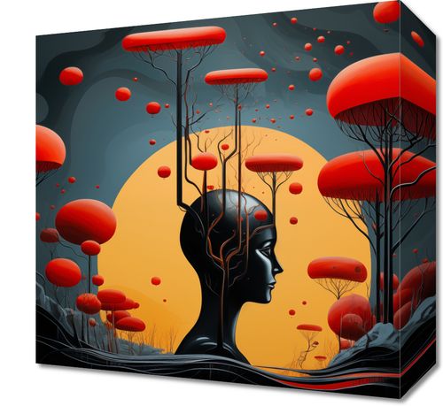 Obraz z serii pop art zatytułowany Myślokształty. Ten obraz przedstawia profil człowieka z głową pełną drzew, które wydają się być przedłużeniem jego myśli i świadomości, symbolizując połączenie umysłu z naturą. Drzewa mają formę fantastycznych, czerwonych kształtów przypominających grzyby, a ich rozgałęzienia łączą się z otaczającą atmosferą, z której unoszą się podobne formacje. Kontrastujące kolory, z dominującym czerwieniem i spokojnym tłem, tworzą wizualny dialog między rzeczywistością a wyobraźnią. Obraz zaprasza do refleksji nad bogactwem wewnętrznego świata i jego wpływem na percepcję zewnętrznej rzeczywistości, będąc wyjątkowym dodatkiem do każdego środowiska poszukującego głębi i inspiracji.