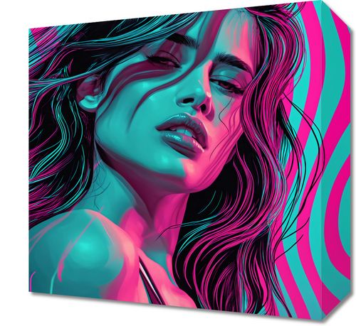 Obraz z serii pop art zatytułowany Neonowy Wzrok. Przedstawia on postać kobiety w stylu neonowej fantazji, z jej włosami i konturami twarzy podświetlonymi żywymi barwami cyjanu i różu na tle hipnotyzujących, pulsujących linii. Dynamiczna kompozycja i odważne kolory odzwierciedlają witalność i energię, jednocześnie wprowadzając element futurystycznego stylu. Ten obraz jest doskonałym uzupełnieniem nowoczesnego wnętrza, które chce wprowadzić mocny, wizualny akcent, idealny do miejskich loftów, salonów mody lub awangardowych przestrzeni galerii.