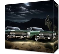 Obraz z serii wnętrza zatytułowany Nostalgiczne Spotkanie ukazuje dwa klasyczne samochody z lat 50., zaparkowane bok w bok pod rozgwieżdżonym nocnym niebem. W tle majestatyczne, ciemne góry rysują się na horyzoncie, a pomiędzy nimi a samochodami rozpościera się dzika pustynna sceneria, z charakterystycznymi kaktusami saguaro. Oświetlone przez delikatne światło księżyca, pojazdy prezentują swoje błyszczące, zadbane karoserie, które odbijają blask gwiazd. Scena ta emanuje spokojem i bezczasowością, przywołując wspomnienia podróży i przygód z minionych epok. Ten obraz doskonale odnajdzie się w przestrzeniach miłośników motoryzacji, retro kawiarniach lub jako elegancki akcent w salonach domowych, inspirując do marzeń o podróży przez historię i amerykański krajobraz.
