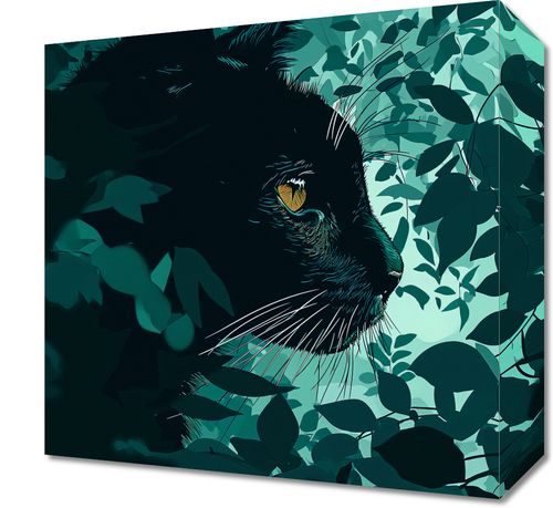 Obraz z serii wnętrza Oczekiwanie, przedstawia portret czarnego kota wtapiającego się w zielone liście. Artysta użył bogatej palety odcieni zieleni, aby stworzyć iluzję kota skrytego w gęstym listowiu, z wyraźnym, żółtym okiem, które przyciąga uwagę i daje wrażenie czujności i tajemniczości. Złożoność wzoru liści kontrastuje z prostotą cienia kota, co nadaje dziełu głębi i wielowymiarowości. Ten obraz byłby idealnym dodatkiem do każdego współczesnego wnętrza, które ceni subtelność i naturę, a także może być interesującym punktem centralnym w galerii sztuki lub przestrzeni wystawienniczej.
