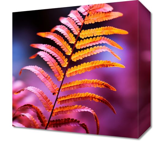 Obraz z serii natura zatytułowany Ogień Jesieni przedstawia pojedynczy liść paproci, który przechodzi przez spektrum ciepłych, jesiennych barw od żółci przez intensywną pomarańcz do głębokiego różu. Kontrastujące, żywe tło w odcieniach purpury podkreśla bogactwo i dynamikę liścia. Delikatne gradacje kolorów oraz wyraźna struktura paproci sprawiają, że obraz wydaje się niemal trójwymiarowy. Ta fotografia to idealny element dekoracyjny, który wprowadzi życie i ciepło do każdego wnętrza, nadając mu artystycznego charakteru. Doskonale sprawdzi się jako wyrazisty akcent w nowoczesnym salonie, sypialni lub biurze, szczególnie dla osób ceniących sobie naturę i jej niezwykłą paletę barw.