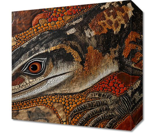Obraz z serii abstrakcja zatytułowany Oko Jaszczurki. Fascynujące dzieło sztuki przedstawia zbliżenie na oko jaszczurki, które jest wykonane z niezwykłą dbałością o detale. Bogata faktura skóry zwierzęcia oraz użycie techniki przypominającej pointylizm sprawiają, że obraz zyskuje trójwymiarową głębię i realizm. Dynamiczna paleta barw, od głębokich odcieni brązu po złote i pomarańczowe akcenty, podkreśla dziką i pierwotną esencję natury. Obraz ten idealnie wpasuje się w dekoracje wnętrz o tematyce przyrodniczej, jak również stanowić może wyrazisty element w przestrzeniach edukacyjnych, takich jak sale biologiczne czy przyrodnicze, a także jako elegancki akcent w przestrzeniach mieszkalnych dla miłośników natury i dzikiej fauny.