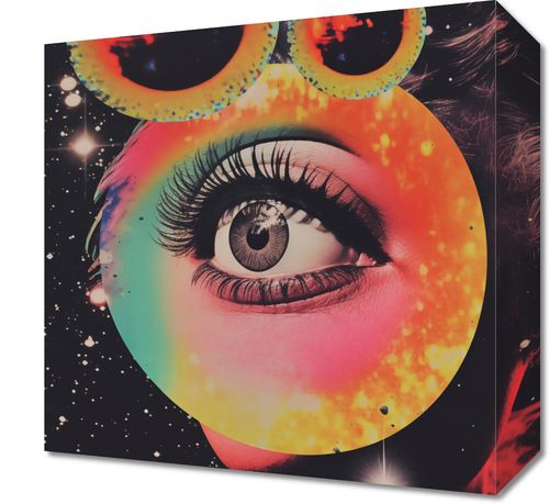 Obraz z serii pop art zatytułowany Oko w Kosmosie. Ten dynamiczny obraz to połączenie surrealistycznego portretu i kosmicznej odyseji. Centralnym punktem jest oko, które jest zarówno oknem na duszę, jak i lustrzanym odbiciem wszechświata, otoczone przez płomienne kolory galaktycznej mgławicy. Nad okiem widnieją okulary przeciwsłoneczne, w których lustrzanych szkłach odbijają się planety, nadając kompozycji głębi i zadziwiającej perspektywy. Ten obraz, pełen barw i kontrastów, to wspaniały wybór dla tych, którzy pragną dodać odrobinę kosmicznego surrealizmu do swojego wnętrza, idealnie sprawdzając się w przestrzeniach artystycznych, takich jak galerie sztuki, studia projektowe lub awangardowe salony.