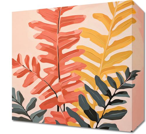 Obraz z serii wnętrza zatytułowany Paleta Natury. Zmysłowa gra kolorów liści, od delikatnych odcieni różu, przez intensywną czerwień, aż po złociste żółcie, kreuje uczucie ciepłego lata przenikającego do wnętrza domu. Delikatność i jednocześnie wyrazistość kształtów liści dodają kompozycji głębi i elegancji. Pastelowe tło harmonizuje z barwami roślin, tworząc spójną i relaksującą całość. Ten obraz doskonale odnajdzie się w modnych salonach, w przestrzeniach wellness, czy też w kawiarniach o nastrojowym, botanicznym klimacie, gdzie natura spotyka się ze sztuką.