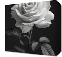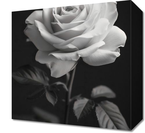 Obraz z serii wnętrza zatytułowany Płatki Róż. Obraz przedstawia ponadczasowy, monochromatyczny obraz róży. Róża, z delikatnymi i szczegółowymi płatkami, jest wyeksponowana na ciemnym tle, co wyostrza jej obrys i podkreśla subtelne niuanse jej formy. Gra światła i cienia nadaje głębi i trójwymiarowości, a ułożenie płatków w pełnym rozkwicie symbolizuje piękno i doskonałość. Liście i łodyga są skromne, ale wyraźne, dodając naturalności całej kompozycji. Obraz oddaje esencję delikatności i elegancji róży, co sprawia, że jest idealny dla każdego, kto szuka elementu dekoracyjnego o subtelnym pięknie i spokojnej, relaksującej estetyce.