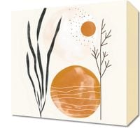 Obraz z serii wnętrza zatytułowany Przebłysk. Obraz prezentuje abstrakcyjną kompozycję o spokojnej, naturalnej kolorystyce, z dominującymi odcieniami beżu, pomarańczu i czerni. Centralne miejsce zajmują dwa okręgi, które mogą symbolizować słońce i księżyc lub inne astronomiczne ciała, z subtelnymi detalami przypominającymi krążki planetarne lub satelity. Obok nich znajdują się stylizowane rośliny lub trawy, które swoją smukłą formą i ciemnym kolorem tworzą kontrast wobec jaśniejszego tła. Dodatkowy element graficzny w postaci gałęzi z prostymi liniami przypomina drzewo lub krzew, dodając kompozycji organicznego charakteru. Całość jest utrzymana w stylistyce minimalizmu, z delikatnymi teksturami i rozpryskami, które nadają dziełu lekkości i nowoczesnego wyglądu. Ograniczona paleta barw oraz proste formy sugerują spokój i harmonię, co czyni obraz odpowiednim dla przestrzeni, które mają za zadanie inspirować do wyciszenia i refleksji.