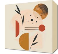 Obraz z serii boho zatytułowany Przyrost do Tła.Obraz przedstawia abstrakcyjną kompozycję złożoną z prostych, geometrycznych form i roślinnych motywów. Dominują tutaj ciepłe odcienie pomarańczowego, różu i brązu, które mieszają się z czernią i beżem. Na pierwszym planie mamy elementy roślinne, które mogą przypominać liście lub gałązki, zaś w tle znajdują się różnej wielkości i faktury koła. Całość jest stylizowana i uproszczona, co daje efekt współczesnego, designerskiego dzieła sztuki. Plakat może inspirować poczuciem spokoju i natury, jednocześnie zachowując modernistyczne uczucie. Idealnie wpasuje się w nowoczesne wnętrze jako centralny punkt dekoracyjny lub delikatne uzupełnienie estetyczne.