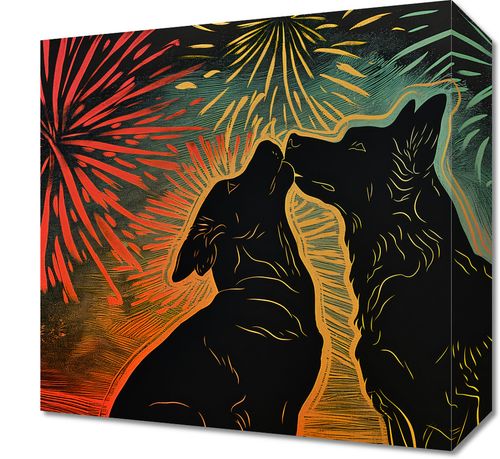 Obraz z serii abstrakcja zatytułowany Psi Uścisk. Przedstawia on dwie sylwetki psów, które wydają się być zwrócone ku sobie w gest podobny do uścisku, na tle intensywnie kolorowego nieba z fajerwerkami. Barwy od czerwieni po żółcie i zielenie tworzą tło, które wygląda jak nocne niebo w trakcie świętowania. Styl graficzny jest dynamiczny i pełen energii, a linie tworzące sylwetki psów są płynne i wyraziste. Ten obraz wyraża radość i nieodłączną więź pomiędzy zwierzętami, będąc doskonałym dodatkiem do wnętrz, gdzie chcemy podkreślić ciepło i pozytywne emocje.