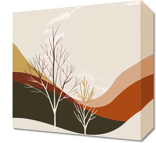 Obraz z serii minimalistyczne zatytułowany Pustynia Widzi. Obraz ukazuje dwie subtelne, ogołocone z liści drzewa, które wyłaniają się z miękkich, falujących form pustynnych wydm. Barwy są stonowane, z dominującymi odcieniami brązu, beżu i terakoty, co oddaje ciepłą i suchą atmosferę pustyni. Tło zawiera tekstury, które mogą przypominać piasek lub delikatną gęstwinę. Ten obraz doskonale sprawdzi się jako dodatek do wnętrz w stylu natur, dodając im ziemiściej palety i przywołując poczucie spokoju oraz prostoty. Będzie się dobrze komponować w przestrzeniach takich jak salon, pokój relaksu, a nawet biuro, wprowadzając elementy spokojnego krajobrazu, które mogą inspirować i uspokajać.
