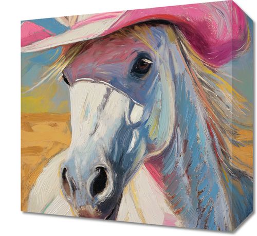 Obraz z serii pop art zatytułowany Różowy Kapelusz to barwna i pełna życia ilustracja przedstawiająca portret konia w różowym kapeluszu kowbojskim. Wyraźne, dynamiczne pociągnięcia pędzla i bogata paleta barw nadają obrazowi wrażenie ruchu i żywiołowości. Tło w ciepłych odcieniach żółci i błękitu podkreśla sylwetkę konia, a różowy kapelusz dodaje humorystyczny, ale i elegancki akcent kompozycji. Obraz ten idealnie nadawałby się do dekoracji wnętrz z charakterem, takich jak westernowe bary, restauracje z amerykańską tematyką, pokoje młodzieżowe czy inne przestrzenie, które chcą wprowadzić element zabawy i niekonwencjonalności.