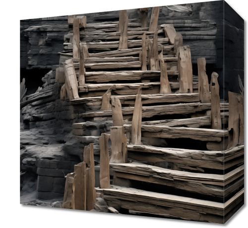 Obraz z serii pejzaże zatytułowany Schody do Nieznanego. Ten tajemniczy i intrygujący obraz przedstawia prymitywne, drewniane schody prowadzące w górę przez strukturę przypominającą starożytną ruiny lub naturalne formacje skalne. Zanurzone w półmroku, schody te wydają się zapraszać odkrywców do podjęcia podróży w nieznane, pełnej nieoczekiwanych odkryć. Obraz ten idealnie oddaje uczucie odkrycia i przygody, idealny dla przestrzeni zainspirowanych historią, naturą, czy literaturą eksploracyjną. Może stanowić inspirujący element w domach, biurach, a także w przestrzeniach publicznych takich jak kawiarnie tematyczne lub księgarnie.