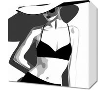 Obraz z serii abstrakcja zatytułowany Strój. Prezentuje stylizowany czarno-biały wizerunek kobiety w dwuczęściowym stroju kąpielowym. Postać odziana jest w szerokobrzmiony kapelusz, który rzuca cień na jej twarz, podkreślając elegancki i tajemniczy charakter kompozycji. Kobieta stoi w pozycji trzy czwarte, z jedną ręką opuszczoną wzdłuż ciała, a drugą lekko zgiętą w łokciu, co dodaje dynamizmu ilustracji. Obraz jest utrzymany w minimalistycznym stylu z wykorzystaniem płaskich plam kolorów i wyraźnych linii, co nadaje mu nowoczesny i modny wygląd. Ten rodzaj grafiki idealnie wpasuje się w nowoczesne wnętrza, szczególnie te o monochromatycznej kolorystyce, lub jako modny akcent w przestrzeniach o minimalistycznej estetyce.