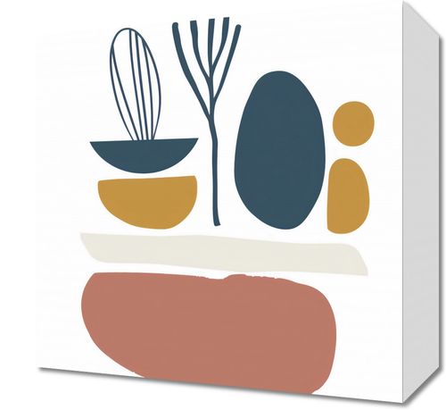 Obraz z serii boho zatytułowany Stylowa Roślinność.Na obrazie widnieje minimalistyczna kompozycja w stylu abstrakcyjnym. Grafika składa się z kilku prostych, geometrycznych kształtów w spokojnej palecie kolorów, w tym błękitu, żółci, ciemnej ochry i głębokiego czerwonego. Umieszczone są one na neutralnym, jasnym tle. Z lewej strony widzimy stylizowaną roślinność z wydłużonymi, pionowymi liniami i owalnym kształtem, który może przypominać liść lub płatek. Po prawej stronie, większe bryły koloru tworzą tło dla dwóch mniejszych kół, które mogą symbolizować słońce i księżyc lub inne elementy natury. Całość ma równowagę i wyraża spokój, będąc jednocześnie prosta, ale i intrygująca w swojej formie.