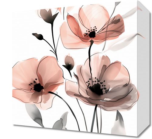 Obraz z serii wnętrza zatytułowany Subtelny Okaz to artystyczna interpretacja delikatnych kwiatów maku. Ilustracja przedstawia kwiaty w pastelowych odcieniach różu i pomarańczy z subtelnymi szarości i akcentami czerni, co nadaje kompozycji miękkiego i eterycznego charakteru. Przezroczyste płatki z lekko zarysowanymi konturami są przedstawione na tle w tonacji jasnego beżu, co pozwala na pełne skupienie na delikatności i pięknie kwiatów. Wykorzystanie minimalizmu i delikatności kolorów sprawia, że obraz emanuje spokojem i elegancją. Idealny do przestrzeni, które cenią sobie spokój i naturę, takich jak salony spa, pokoje gościnne, czy jadalnie, gdzie może dodać odrobinę subtelnego uroku i świeżości.