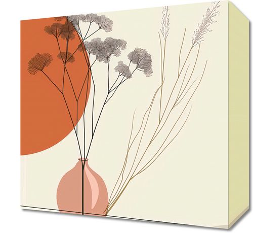 Obraz z serii boho zatytułowany Suszony Widok. Obraz ukazuje zgeometryzowane, stylizowane kwiaty suszonych roślin w wazonie na tle dużego, okrągłego słońca w ciepłych odcieniach pomarańczy i beżu. Kompozycja, w której dominują spokojne, jesiennie nastroje, łączy prostotę formy z bogactwem faktury. Obraz ten doskonale odnajdzie się w wnętrzach o prostym, lecz eleganckim wystroju, takich jak minimalistyczne salony, jadalnie czy hol. Idealnie wpasuje się w otoczenie zarówno nowoczesne, jak i te z nutą retro, wprowadzając ciepło i artystyczną, subtelność.