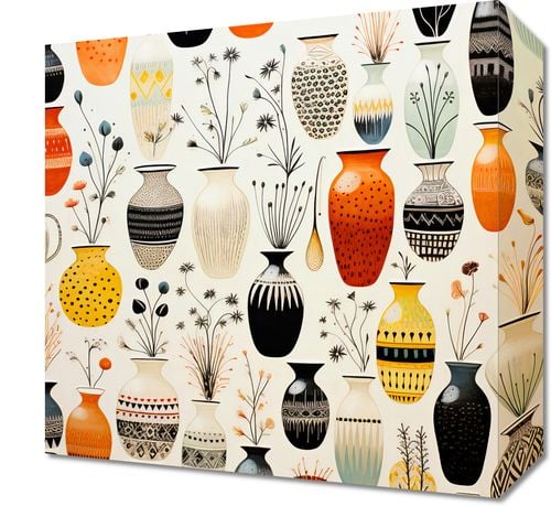 Obraz z serii wnętrza zatytułowany Symfonia Wazonów. Wspaniałe wazony w bogatej palecie kolorów, od głębokiej czerni do ciepłych odcieni pomarańczu, tworzą intrygującą mozaikę wzorów i kształtów. Delikatne motywy roślinne, które zdobią niektóre wazony, dodają uroku i lekkości, a różnorodność wzorów i faktur przyciąga wzrok i zaprasza do głębszej refleksji. Kontrast między jasnymi i ciemnymi barwami, a także subtelne niuanse w każdym wazonie, dodają tej kompozycji głębi i dramatu. Ten artystyczny plakat doskonale wpisuje się w klimat wyrafinowanych galerii sztuki, eleganckich kawiarni oraz nowoczesnych przestrzeni mieszkalnych, które stawiają na unikatowy design.