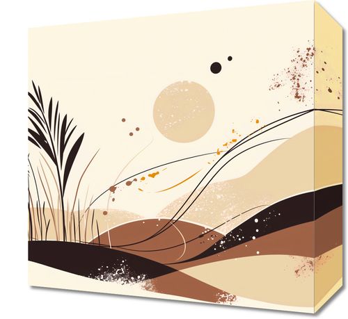 Obraz z serii minimalistycznej zatytułowany Szept Gwizdu. Widać na nim stylizowaną kompozycję z trawami i kształtami, które mogą przywoływać na myśl górskie krajobrazy. Barwy są ciepłe i naturalne, z dominującymi beżami, brązami oraz akcentami w kolorze terakoty.Ten plakat doskonale uzupełni wnętrza w stylu boho, skandynawskim, jak również te o bardziej rustykalnym czy naturalnym charakterze. Jego spokojna paleta kolorów i subtelna grafika sprawią, że będzie idealnym dodatkiem do sypialni lub salonu, wprowadzając atmosferę relaksu i spokoju.
