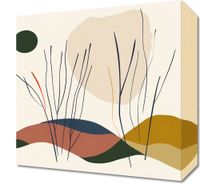 Obraz z serii boho zatytułowany Szept Wiatrów. Grafika przedstawia abstrakcyjny pejzaż, w którym finezyjne, czarne linie wyobrażają łagodnie kołyszące się trawy. Kształty w ciepłych odcieniach ziemi tworzą iluzję wzgórz i ścieżek, a dyskretna zielona kropka w górnym rogu zdaje się być echem oddalającego się słońca lub zapowiedzią zmierzchu. Wszystko to ujęte na tle delikatnego beżu, co nadaje dziełu spokojny, relaksujący nastrój. Obraz ten idealnie wpasuje się w wnętrza, które aspirują do wyciszenia i harmonii z naturą, jak przytulne salony, jadalnie, czy miejsca przeznaczone do medytacji. Może być również pięknym, uspokajającym dodatkiem do biur, bibliotek czy innych przestrzeni wymagających skupienia i spokoju.