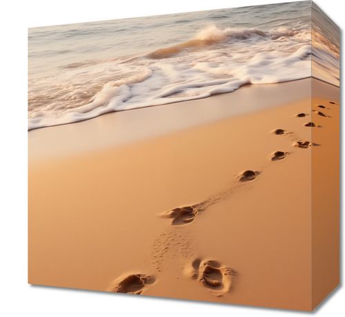 Obraz z serii pejzaże zatytułowany Szepty Fal przedstawia obraz, który zaprasza widza do kontemplacji i refleksji. Delikatne ślady stóp wskazują na cichą obecność, a przytłumione szumy fal i miękki piasek podkreślają uczucie spokoju. Rozmyte kolory zachodu słońca, które malują niebo na niemal nierzeczywiste odcienie pomarańczy i błękitu, wydają się być synonimem spokojnego zakończenia dnia. Ta praca idealnie wkomponuje się w estetykę współczesnych salonów lub pokoi wypoczynkowych, które cenią sobie minimalizm i naturę, a także będzie znakomitym wyborem dla przestrzeni wellness i spa, gdzie harmonia i spokój są kluczowymi elementami.