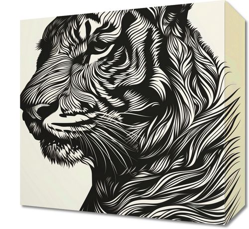 Obraz z serii wnętrza zatytułowany Tygrysi Gwizd. Ta dramatyczna grafika przedstawia tygrysa w stylu linorytu, z wyraźnymi, płynnymi liniami układającymi się w złożony wzór futra. Monochromatyczna paleta, z ciemnymi i jasnymi odcieniami na neutralnym tle, podkreśla majestatyczną postawę i intensywny wzrok tego dzikiego zwierzęcia. Obraz emanuje siłą i elegancją, oddając w pełni królewski charakter tygrysa. Idealny do wnętrz urządzonych w stylu minimalistycznym lub nowoczesnym, będzie także pasował do przestrzeni, które chcą podkreślić motywy przyrodnicze lub eksplorować tematykę ochrony dzikiej przyrody.