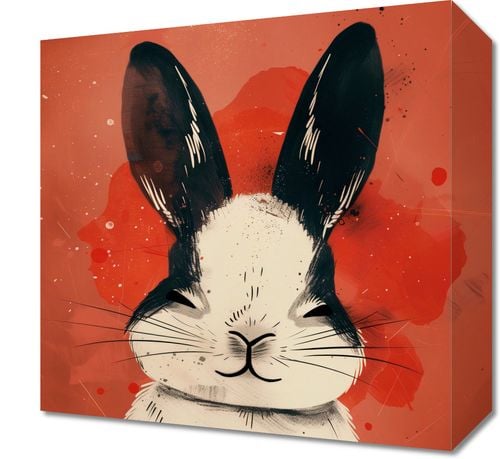 Obraz z serii abstrakcja zatytułowany Uśmiech! przedstawia wizerunek królika w stylistyce inspirowanej street art'em. Tło w ciepłej, czerwonej kolorystyce jest pokryte energicznymi plamami i rozpryskami farby, nadając dynamizmu całości kompozycji. Królik jest przedstawiony frontowo, z głową skierowaną prosto na widza. Jego uszy są wyraziste, czarne z białymi akcentami, co daje efekt trójwymiarowości. Urocza twarz zwierzęcia z subtelnym uśmiechem i charakterystycznymi wąsami wydaje się emanować spokojem i ciepłem. Detale takie jak tekstura futra królika są zaznaczone delikatnymi liniami i cieniowaniem, co dodaje realizmu i głębi grafice. Obraz ten sprawdziłby się jako dekoracja w przestrzeniach współczesnych, które cenią sobie oryginalność i lekkość wizualną, a jednocześnie wprowadza przytulny, domowy nastrój.