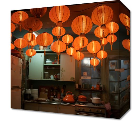 Obraz z serii motywy wschodnie zatytułowany W Blasku Lampionów. Ten przytulny obraz przedstawia sznur ciepłych, pomarańczowych lampionów zawieszonych w przestrzeni kuchni, które oświetlają wnętrze domowym ciepłem. Lampiony, w tradycyjnym azjatyckim stylu, z ciepłym światłem, nadają pomieszczeniu uczucie gościnności i spokoju. Przywołując na myśl spokojne wieczory, ten obraz idealnie wpasuje się w wnętrza inspirowane dalekowschodnią estetyką oraz w każde miejsce, gdzie chcemy dodać odrobinę orientalnego uroku. Świetnie sprawdzi się w kuchniach, salonach, a także w przestrzeniach komercyjnych takich jak restauracje serwujące azjatycką kuchnię czy teahouse'y.
