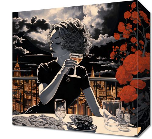 Obraz z serii pejzaże zatytułowany Wieczorne Toasty. Zadziwiająca kobieta o falujących włosach siedzi przy stole, unosząc kieliszek w towarzystwie wielkiego, olśniewającego księżyca. Jej kontury i sylwetka wyróżniają się na tle nocnego miasta, gdzie światła budynków błyszczą w oddali. Pomarańczowe kwiaty dodają życia i koloru do monochromatycznej palety, a ich ciepły odcień kontrastuje z chłodnym blaskiem księżycowego światła. Delikatne detale, takie jak ornamenty na obrusie czy odbicia w szkle, dodają głębi i finezji kompozycji. Idealnie nadaje się do eleganckich kawiarni, restauracji na dachu oraz nowoczesnych apartamentów z widokiem na miasto.