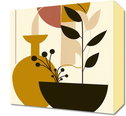 Obraz z serii minimalistyczne zatytułowany Wielkość Natury. Zaprezentowana jest tutaj elegancka kompozycja roślin w prostym naczyniu, zestawiona z geometrycznymi blokami kolorów w ciepłej, naturalnej palecie. Przywodzi ona na myśl harmonię i zorganizowaną prostotę, które można znaleźć w naturze, jak również w ludzkich tworach. Elementy w kształcie koła i półkola nadają kompozycji spokoju i równowagi, a linie i bloki kolorów tworzą poczucie głębi i struktury. Ten obraz będzie idealny do wnętrz, gdzie ceni się porządek i minimalistyczne podejście do dekoracji, wnosząc jednocześnie elementy natury i spokoju. Idealny do umieszczenia w przestrzeniach takich jak nowoczesne salony, eleganckie gabinety, lub jako spokojne tło w przestrzeniach biurowych.