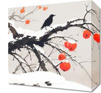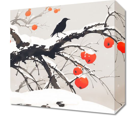 Obraz z serii motywy wschodnie zatytułowany Wschodnia Akwarela przedstawia zimowy krajobraz w stylu wschodnim. Drzewo o ciemnych, wyrazistych gałęziach pokrytych śniegiem wygina się elegancko na tle spokojnego, jednolitego tła. Na gałęziach znajdują się czerwone owoce, które mogą być symbolem persymonów lub innych zimowych owoców, kontrastujących swoim żywym kolorem z zimowym otoczeniem. Na jednej z gałęzi spoczywa czarny ptak, być może kruk, co dodaje życia i głębi kompozycji. Spadające płatki śniegu i subtelne odcienie w tle nadają scenie uczucie spokoju i ciszy. Ten obraz łączy prostotę z elegancją, mogąc stanowić wyrafinowaną dekorację w przestrzeniach szukających spokojnej, lecz wyrazistej estetyki.