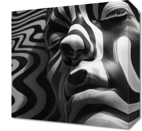 Obraz z serii abstrakcja zatytułowany Wtop Się We Mnie. Ten monochromatyczny obraz przedstawia zbliżenie na twarz kobiety, której skórę zdobią hipnotyzujące, czarno-białe wzory przypominające zebry. Skontrastowane linie zygzakowato przecinają płaszczyznę obrazu, tworząc złudzenie ruchu i głębi. Obraz jest przykładem wyrafinowanego połączenia sztuki portretowej z abstrakcyjnym designem, idealny do pomieszczeń o minimalistycznym lub nowoczesnym wnętrzu, takich jak galerie sztuki, nowoczesne biura, a także jako oryginalny akcent w domowym salonie. Jego unikalny styl przyciąga wzrok i zmusza do refleksji, stanowiąc idealny temat do rozmów w przestrzeniach społecznych.