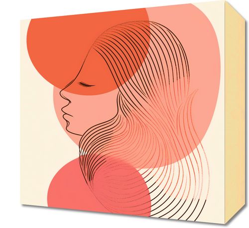 Obraz z serii minimalistyczne zatytułowany Zmierzch Linijny. Delikatny profil kobiety jest zarysowany z wykorzystaniem cienkich, precyzyjnych linii, które przywodzą na myśl delikatne włosy rozwiane przez wieczorny wiatr. Tło w ciepłych odcieniach różu i pomarańczy tworzy atmosferę zachodzącego słońca, która delikatnie obejmuje jej postać. Ta artystyczna kompozycja ukazuje spokój i refleksję, nawiązując do końca dnia i momentów introspekcji. Idealnie nadaje się do umieszczenia w przestrzeniach, które mają być oazą relaksu i spokoju, takich jak sypialnie, pokoje do medytacji czy przytulne zakątki w domach i apartamentach, gdzie może stanowić zaproszenie do chwili zadumy.