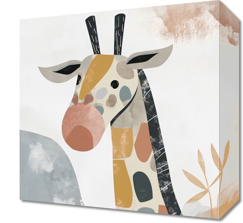 Obraz z serii wnętrza zatytułowany zatytułowany Żyrafa Bambino przedstawia stylizowany wizerunek żyrafy, którego cechy zostały zredukowane do prostych, geometrycznych kształtów i bloków pastelowych barw. Delikatne tekstury i ciepłe odcienie tworzą harmonijną kompozycję, która przyciąga wzrok i wprowadza do wnętrza spokój. Tło jest minimalistyczne z akcentami abstrakcyjnych form, co dodatkowo podkreśla nowoczesny charakter dzieła. Ten obraz będzie idealnym dodatkiem do przestrzeni o współczesnym designie, takich jak nowoczesne biura, kreatywne przestrzenie pracy, a także do pokojów dziecięcych lub wszędzie tam, gdzie chcemy dodać odrobinę zabawy i elegancji.