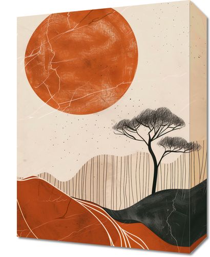 Obraz z serii boho zatytułowany Afrykański Zachód Słońca przedstawia malowniczą scenę z ciepłymi, ziemistymi barwami symbolizującymi niekończącą się pustynię. Wielkie, płonące słońce w kolorze rdzy wisi nad delikatnie zarysowanymi drzewami akacji, które są ikoniczne dla afrykańskiego krajobrazu. Linie konturów wzgórz i pustynnych wydm dodają głębi i perspektywy, a rysunkowe pęknięcia i plamy na słońcu nadają teksturę. Ta kompozycja łączy surowość pustyni z zachwycającym pięknem dzikiej przyrody, idealna dla wnętrz, które pragną odrobiny egzotyki i ciepła afrykańskich barw.