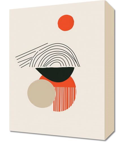 Obraz z serii boho zatytułowany Centralne Słońce to dzieło artystyczne utrzymane w stonowanej palecie kolorystycznej, na którym dominują geometryczne kształty i linie. Na górnej części kompozycji widnieje małe, jaskrawe czerwone koło, które może symbolizować słońce lub inny punkt centralny. Poniżej znajduje się czarna, półokrągła forma z koncentrycznymi liniami, przypominającymi ułożenie naturalnych warstw kamienia lub drzewa. Tuż obok, kontrastujące z nią, znajduje się większe, jasno beżowe koło, które wraz z czarnym półkolem tworzy iluzję przestrzeni. Na dole obrazu uwagę przyciąga większe, okrągłe pole w odcieniu ciepłego pomarańczu, na którym znajduje się wzór pasków w kierunku pionowym, dodający tekstury i ruchu. Całość utrzymana jest w estetyce minimalizmu i modernizmu, gdzie każdy element, choć prosty, jest starannie wyważony, by współgrać z resztą kompozycji.