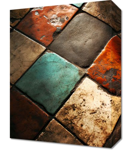 Obraz z serii wnętrza zatytułowany Ceramiczna Kompozycja, przedstawia starannie ułożone, wielokolorowe płytki ceramiczne, które razem tworzą hipnotyzującą kompozycję. Kontrastujące tekstury i kolory płytek - od gorących pomarańczy i czerwieni, przez chłodne błękity, po ziemiście beżowe i szare tony - przypominają o bogatej palecie barw, jakie oferuje natura. Subtelne odbicie światła dodaje głębi i wizualnego zainteresowania, powodując, że wzór wydaje się niemal dynamiczny. Obraz ten mógłby stanowić fascynujący element dekoracyjny w każdym wnętrzu, szczególnie w tych, które celebrują sztukę rzemiosła i naturalną paletę kolorów, jak salony, przestrzenie wspólne, a nawet galerie sztuki.