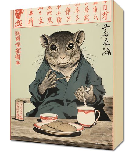 Obraz z serii motywy wschodnie zatytułowany Ceremonia Gryska. Urokliwy portret gryzonia w tradycyjnym stroju wschodnim, siedzącego przed drewnianym stołem z herbatą i przekąskami. Jego przenikliwe oczy, podkreślone przez dokładne szczegóły i fakturę futra, a także starannie wykonane ręce chwytające pałeczki, dodają głębokiego wglądu w codzienne rytuały. Czerwone piktogramy i kaligrafia na jasnym tle wzbogacają kompozycję, nadając jej tradycyjny i kulturowy wydźwięk. Świetnie sprawdzi się w kawiarniach serwujących wschodnie przysmaki, galeriach sztuki oraz w domach miłośników kultury azjatyckiej.