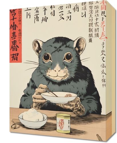 Obraz z serii motywy wschodnie zatytułowany Chwila Refleksji. Intrygujące spojrzenie gryzonia w tradycyjnym stroju, podkreślane przez błękitną tunikę i precyzyjne detale, które nadają mu humanoidalnego charakteru. Czerwone naczynia oraz kanji w tle kontrastują z jasnymi barwami obrazu, dodając nuty głębi i dziedzictwa kulturowego. Subtelna gra światła i cienia na stoliku z jedzeniem i napojem wzbogaca kompozycję i zachęca do refleksji nad połączeniem tradycji z nowoczesnością. Świetnie sprawdzi się w kawiarniach o azjatyckim klimacie, galeriach sztuki oraz w przestrzeniach dedykowanych kulturze Wschodu.
