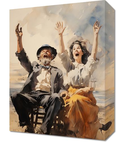 Obraz z serii wnętrza zatytułowany Chwile Radości. Pełne życia i entuzjazmu postacie starego mężczyzny w kapeluszu i młodej kobiety w białej bluzce, obaj z uniesionymi rękami w geście ekscytacji. Tło z rozmazanymi akwarelowymi chmurami i brzegiem morza dodaje uczucie swobody i nieskrępowanej radości. Złote i błękitne odcienie obrazu harmonizują ze sobą, tworząc atmosferę beztroski. Idealny do ozdobienia przestrzeni kawiarnianych, artystycznych galerii lub domowych salonów pragnących wprowadzić do swojego wnętrza nutę optymizmu i spontaniczności.