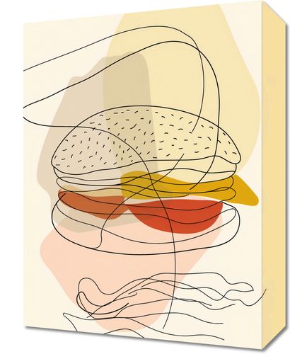 Obraz z serii minimalistyczne zatytułowany Cieniutki Burger to nowoczesna interpretacja klasycznego amerykańskiego dania. Zastosowane pastelowe tony i delikatne linie tworzą eleganckie, niemal oniryczne podejście do przedstawienia smacznego burgera. Warstwy bułki, sera, sałaty, pomidora i kotleta są zredukowane do prostych, płynnych form i kolorów, nadając całości minimalistyczny, ale ciepły charakter. Ten obraz przyciąga uwagę swoją oryginalnością i byłby doskonałym, stylowym dodatkiem do nowoczesnej kuchni lub jadalni, wprowadzając element zabawy i kulinarnego sztuką wizualną.