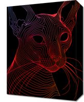 Obraz z serii pop art zatytułowany Cyfrowa Kocica przedstawia futurystyczny wizerunek kota sfinksa, wykonany za pomocą płynnych, abstrakcyjnych linii w odcieniach czerwieni i pomarańczu na głębokim, czarnym tle. Wzór linii tworzy iluzję trójwymiarowości i ruchu, podkreślając wyraziste cechy kociego profilu, takie jak duże uszy, wyłaniające się oczy i charakterystyczne rysy twarzy. Minimalistyczne użycie koloru i linii w kontraście z ciemnym tłem nadaje dziełu nowoczesny wygląd, który przyciąga wzrok i pobudza wyobraźnię. Ten artystyczny obraz świetnie wpisze się w wnętrza o nowoczesnym designie, szczególnie wśród miłośników zwierząt i miłośników sztuki cyfrowej, nadając przestrzeni odrobinę współczesnego stylu i kociego wdzięku.