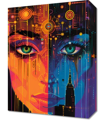 Obraz z serii abstrakcja zatytułowany Cyfrowa Psyche. Przedstawia fascynującą symetrię między ludzką urodą a technologicznym zawirowaniem. Wyraźne, zielone oczy kobiety są centralnym punktem obrazu, ożywione wizją elektronicznych obwodów i cyfrowych sygnałów, które przepływają przez i wokół jej wizerunku. Przecinające twarz linie symbolizują połączenie osobowości z nowoczesnymi technologiami, podczas gdy tło ukazuje zarys charakterystycznego krajobrazu miejskiego. Intensywne, neonowe kolory od pomarańczowego do niebieskiego nadają dziełu dynamiczny i nowoczesny charakter. Obraz ten będzie idealnym dodatkiem do współczesnych biur, salonów gier lub innych przestrzeni kreatywnych, które celebrują połączenie sztuki i technologii.