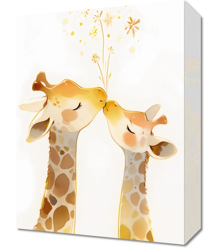 Obraz z serii wnętrza zatytułowany Czułość w Miłości przedstawia dwie kochające się żyrafy, które delikatnie dotykają się nosem, tworząc wzruszający obraz czułości i więzi. Z ich punktu styku wyłania się bukiet subtelnych, złocistych kwiatów, symbolizujących kwitnącą miłość i delikatność emocji. Żywe, ciepłe kolory, od jasnych żółci do bogatych brązów plam żyraf, nadają kompozycji uczucie ciepła i radości. Tło jest czyste i spokojne, co pozwala na pełne skupienie na wzajemnej interakcji postaci. Ten plakat emanuje spokojem i pozytywnością, będąc doskonałym dodatkiem do przestrzeni, które cenią naturę i spokój, takich jak pokoje dziecięce, przestrzenie do wypoczynku, czy przychodnie weterynaryjne.