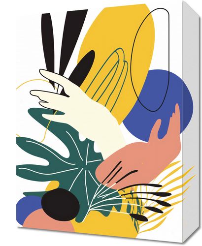 Obraz z serii minimalistyczne zatytułowany Dotyk Tropików. Ten energetyczny i kolorowy obraz przedstawia abstrakcyjną, niemal surrealistyczną wizję tropikalnej roślinności. Wielobarwne kształty łączą się z naturalnymi elementami tworząc efektowną kompozycję, która oddaje bujność i różnorodność tropików. Paleta barw, od głębokiego granatu, poprzez jaskrawy żółty, aż po delikatne pastele, wnosi do wnętrza świeżość i egzotykę.Ten obraz jest idealnym wyborem dla wnętrz, które pragną wnieść żywiołowość i odrobinę egzotyki do codziennej przestrzeni. Doskonale uzupełni jasne i przestronne salony, a także stanie się inspirującym akcentem w kreatywnych pracowniach lub kawiarniach. Może również dodać charakteru nowoczesnym, minimalistycznym biurom, wprowadzając żywe barwy i organiczne motywy.