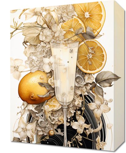 Obraz z serii wnętrza zatytułowany Esencja Cytrusów. Zmysłowy pejzaż ukazuje krystaliczną szampanową kieliszek otoczony bujnym kwiatem i soczystymi plasterkami cytryny. Delikatne białe kwiaty i misternie rysowane detale dodają kompozycji głębi i subtelności, podczas gdy wyraziste żółte akcenty cytryny dodają energii i świeżości. Całość wprowadza w stan relaksu i orzeźwienia, przypominając o chwilach spędzonych na letnich tarasach. Idealnie wpasuje się w eleganckie restauracje, bary koktajlowe lub nowoczesne kawiarnie z akcentami śródziemnomorskimi.